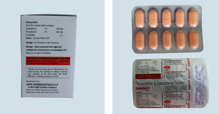 Each film coated tablet contains: Aceclofenac IP 100mg, Paracetamol IP 325mg